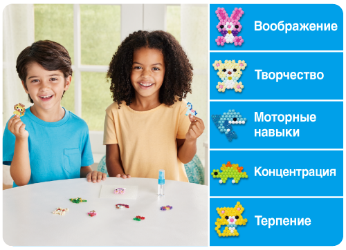 Аквабидс - это игра из бусин, которые волшебным образом соединяются при помощи воды и првращаются в удивительные игрушки после полного высыхания! В течение всего времени игры не требуется термическая обработка или иголка с нитками, поэтому каждый может безопасно заниматься творчеством самостоятельно!